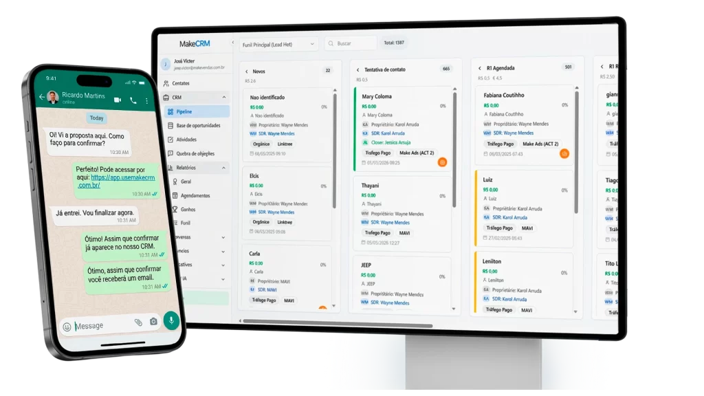 Já o Make CRM prioriza organização do processo de vendas para garantir previsibilidade e controle das negociações.