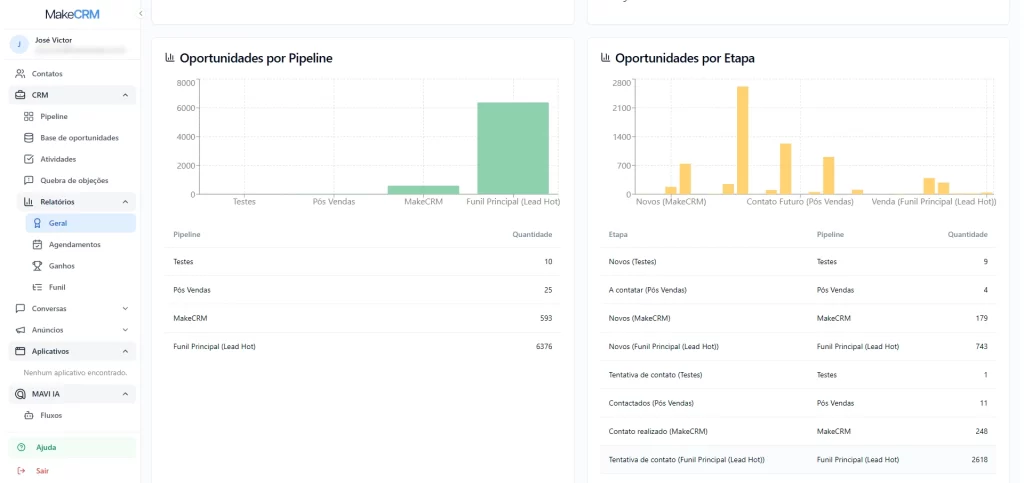 O Make CRM prioriza relatórios e métricas de conversão e gargalos, ajudando a gestão a agir com base em dados.